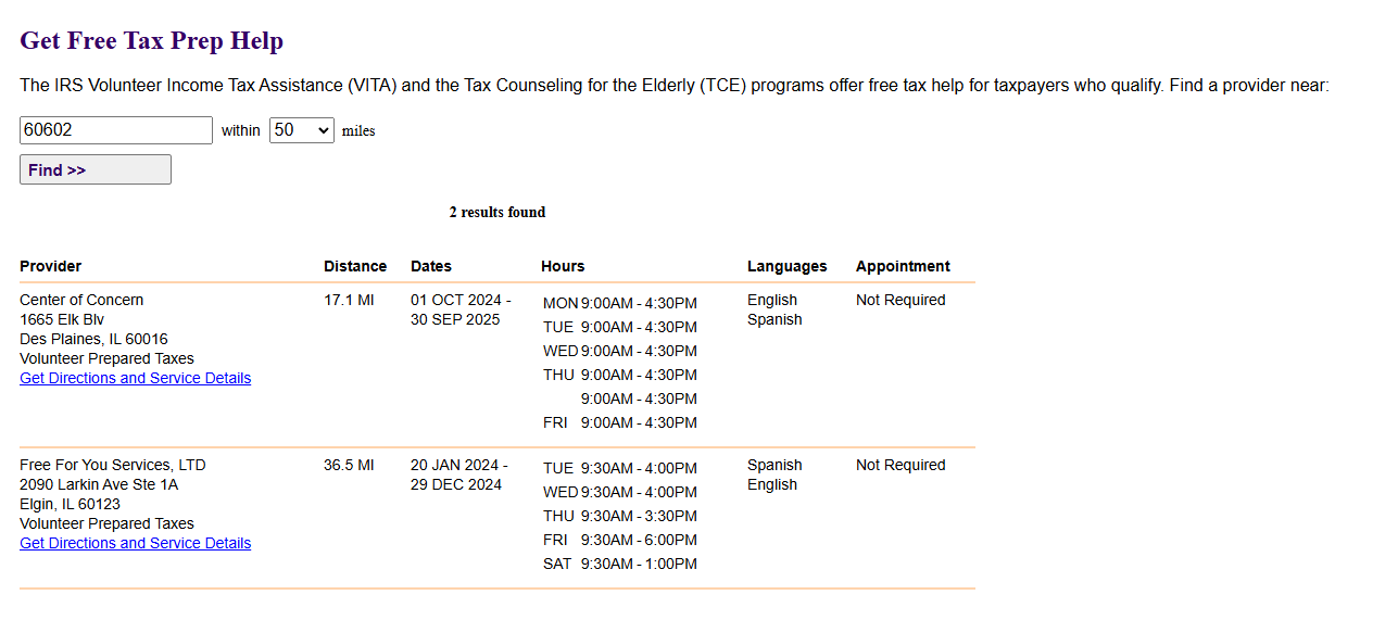 The IRS partners with multiple community organizations to deliver services. Use this IRS VITA/TCE Locator tool to locate a center in your community. Example of information provided.